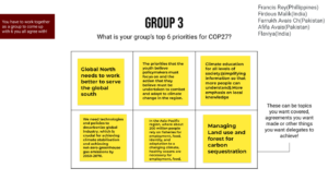 The workshop saw participation from youth from 13 countries from the region, who worked in groups to create lists of their top six, climate action priorities. (see below for an example). The most common priorities included; Centralising marginalised voices, climate education, immediate decarbonisation, global north/south equality, water management, plastic and waste reduction, intra-regional collaboration, and corporate regulation. This statement outlines these priorities that the youth of the region identified as the most important.