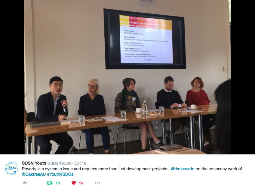 Leaders from prominent Australian youth organisations, including the Oaktree Foundation, Oxfam, YGap, University of Melbourne Student Union, Undress Runways, SDSN Youth, and AIESEC Australia provided their perspectives on the role young people, youth groups and student associations in addressing the SDGs in Australia.
