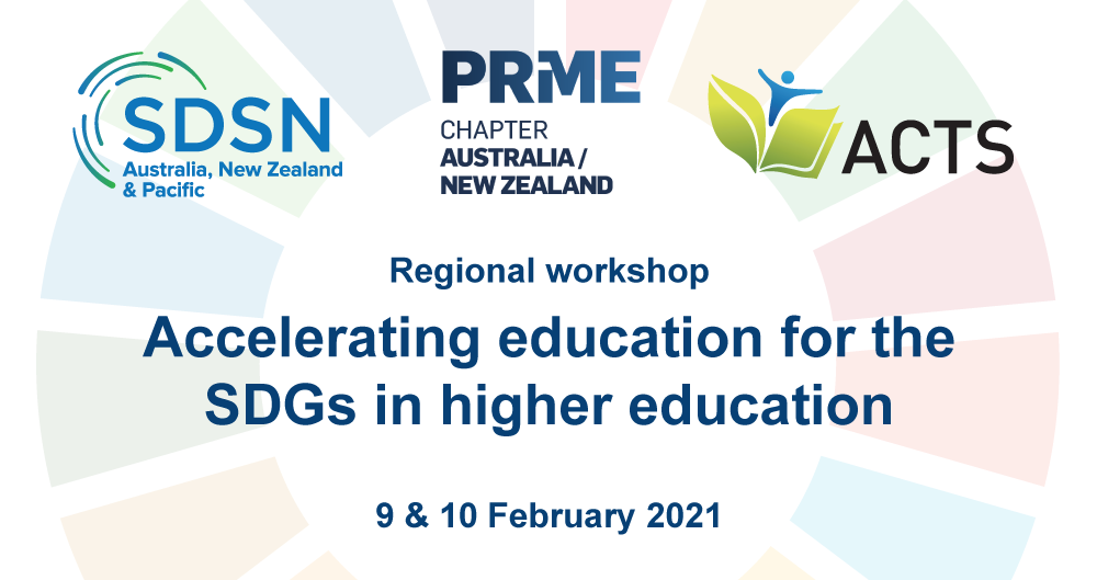 The workshop is being jointly hosted by the Australasian Campuses Towards Sustainability (ACTS), the Principles for Responsible Management Education (PRME) AusNZ Chapter, and the Sustainable Development Solutions Network (SDSN) AusNZPac Regional Network, with the assistance of an Expert Advisory Group from our member institutions. The workshop is part of the ACTS/SDSN AusNZPac Accelerating SDG Practice Initiative, which aims to support our member organisations to strengthen their internal engagement with the SDGs, and the global SDSN Dialogue Series on the new guide on Accelerating Education for the SDGs in Universities. This workshop also supports the UN PRME global movement for education to develop the responsible decision-makers of tomorrow to advance sustainable development and contributes to the AusNZ PRME Community of Practice.