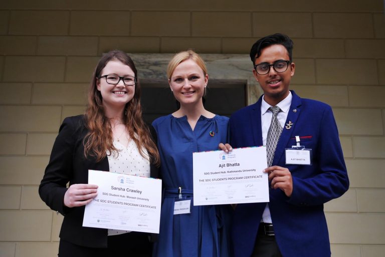 Sarsha Crawley, SDG Coordinator for Monash University, became one of the first recipients of the SDG Students Program Certification, which was awarded at the Vatican Youth Symposium on October 19, 2019. The certificate was jointly developed by SDSN Youth and the Ban Ki-Moon Centre for Global Citizens, and signed by former UN Secretary-General Ban Ki-Moon. It gives recognition to students who have actively participated in the three pillars of “learn about”, “engage with” and “take action” on the SDGs.